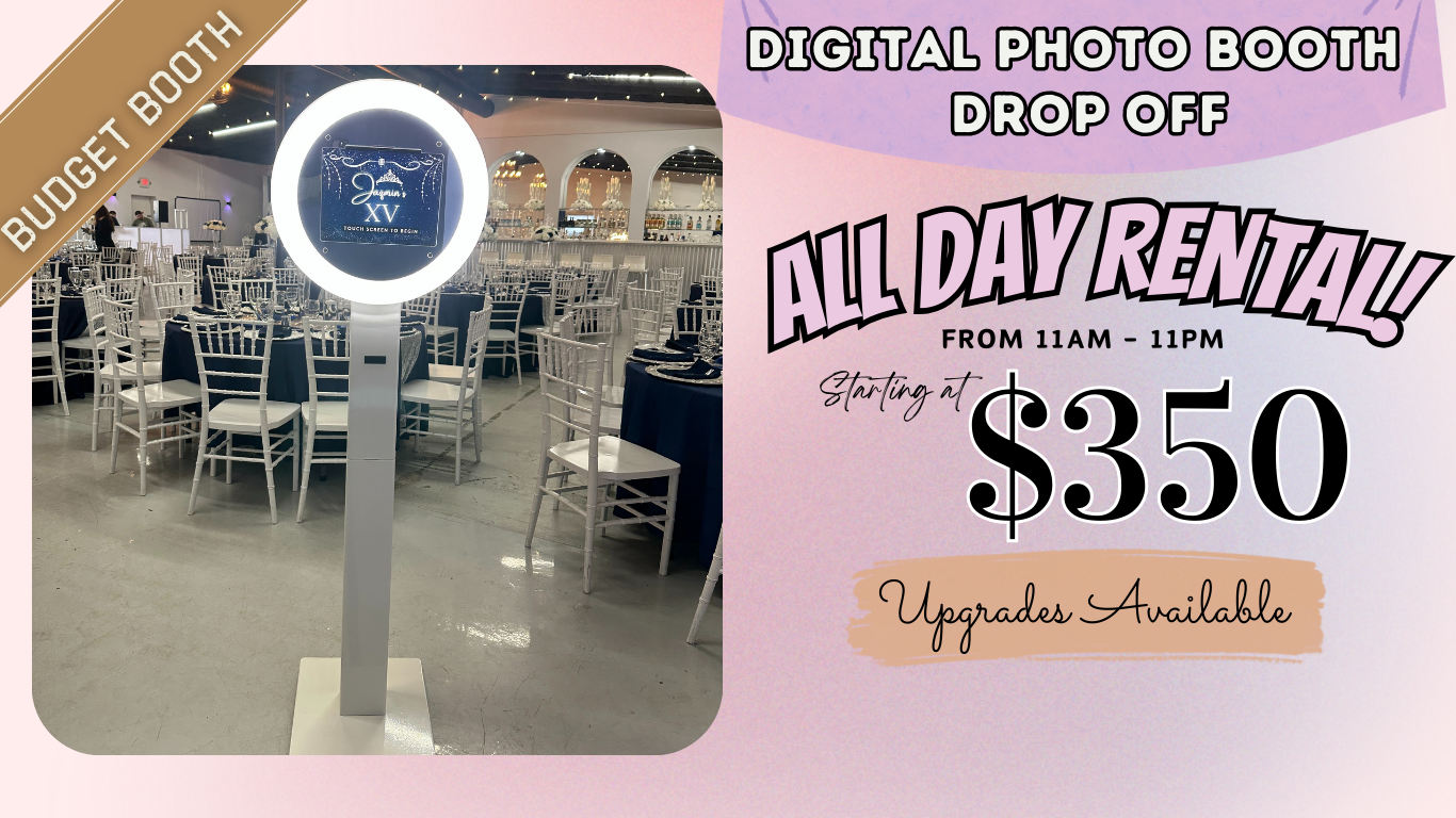 Starting at $350 - ALL DAY! From 11 AM - 11 PM you can rent our Digital Photo Booth drop off only (NO PRINT) with 2x6 or 4x6 template design included and pay for additional of your desire upgrades like premium backdrop, prop table, power bank and more. 2x6 or 4x6 template design included. This Photo Booth share your photos instantly via SMS, Qr Code, Email and Airdrop. Delivery, Set up and Teardown Included.